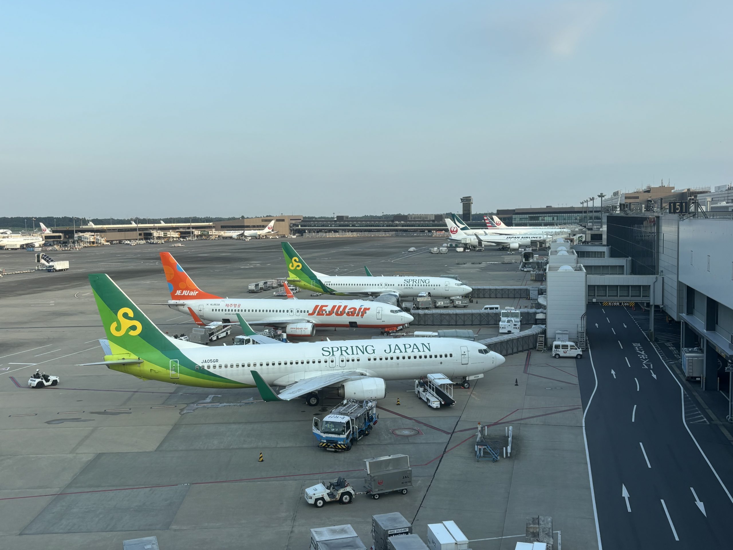 LCCで使用される機材は、シートピッチが狭いことが特徴です。同じB737で比べると、FSCと同じシートピッチを採用しているスカイマークは177席。対して、LCCであるスプリングジャパンは189席で、12席・約7%多いです。