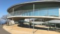 凹凸が大きなタイル?のカーテンウォールは、重厚な印象を与えます。落ち着いた意匠設計が公共建築らしいです。上層部の飛び出した円盤のように、部分的なアクセントが加えられています。