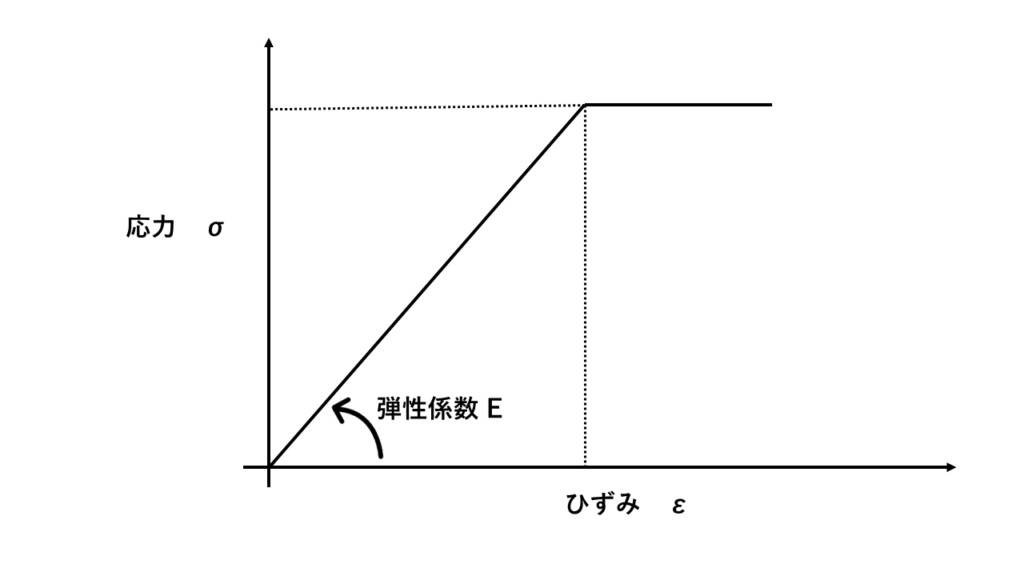 変形係数E50は、構造力学の弾性係数・ヤング係数と同じ役割です。まず構造力学の弾性係数・ヤング係数を見ていきましょう。次の図は鉄筋のひずみ・応力曲線です。