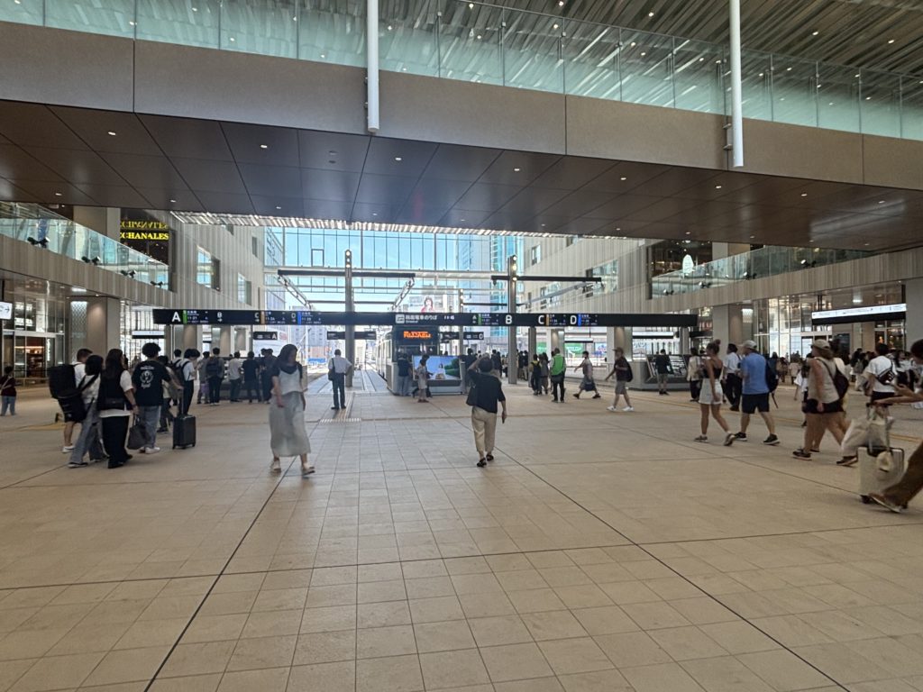 2025年8月に乗り入れが開始した、新しい広電広島駅に行ってきました。中央改札口を出て右に曲がると、目の前に路面電車乗り場が見えてきます。乗り場は天井が高く、とても開放的な空間になっていました。